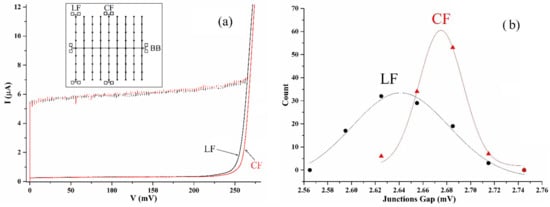 (a) The current–voltage characteristics of central finger (red) and last finger (black); (b) the statistical distributions of the gaps of lateral finger (LF) and central finger (CF). We can clearly see the finite size effect of the comb structure through the gap increase of the central finger with respect to the lateral finger.