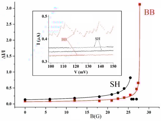 The red squares show the relative average increase (ΔI) of the Josephson critical currents of the BB array of the complete double comb (Figure 1b) with respect to that (BBR) of the reference array (Figure 1c) measured for increasing values of an applied external magnetic field. The relative increase is normalized to the average current of the reference array for each field: we can see that for a field value of B = 27.5 G, the average Josephson current of the backbone array is more than three times higher than the currents of the reference array (as visible in the inset). The black circles show the dependence of the difference between the average Josephson critical current heights of SH and BBR arrays: in this case, we can see that there are no sharp increases like for the black squares. This effect is also visually illustrated in the inset where we see that the “shorted fingers” array currents remain much lower than the values attained by the backbone of the complete comb structure.