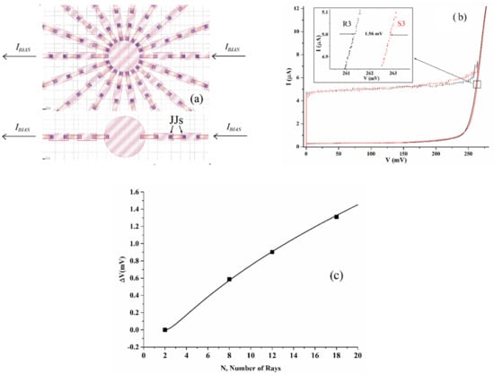 In Figure 5c, we have a plot of the increase of the gap voltage-sum for star arrays having different branches, all measured at a current of 5 μA. The increases are all measured with respect to geometrically equivalent samples having N = 2 and, therefore, for N = 2 we have ΔV = 0. Each experimental point in the plot refers to a set of four measurements performed on different days on a specific chip and the error bars would not be visible in the plot. In the figure, a comparison between experimental values and theoretical expectations is also presented. In particular, it is expected that the gap voltage-sum is described by the relation