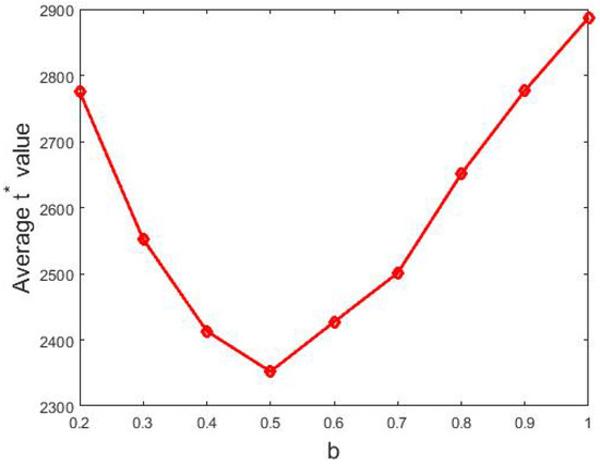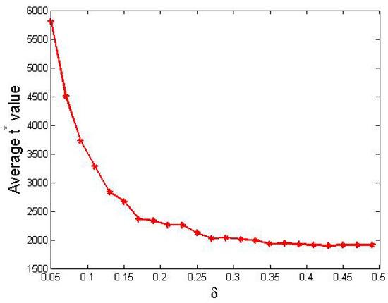 For the simulations in this subsection, N and were set to 200 and , respectively. To evaluate the impacts of , we tested each value in for this parameter. For each such value, we conducted simulations 500 times and obtained the value over these runs.