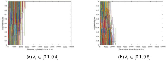 - If two agents with opposite opinions meet each other, their confidence in previous opinions will be weakened, i.e., one support degree will be increased while the other will be decreased. Without loss of generality, we assume that and the respective updates are described below.