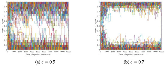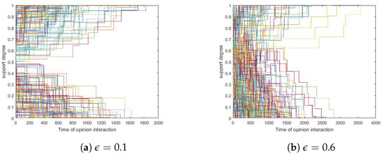 Since simulations showed that different values present similar trends concerning convergence, we took two runs as examples in which was set to and , respectively, and we present them in Figure 1 here. Among all simulations, we found that those models with quickly converge (form a consensus) while those with failed to do so within iterations, as is vividly shown in the two sub-figures of Figure 1.
