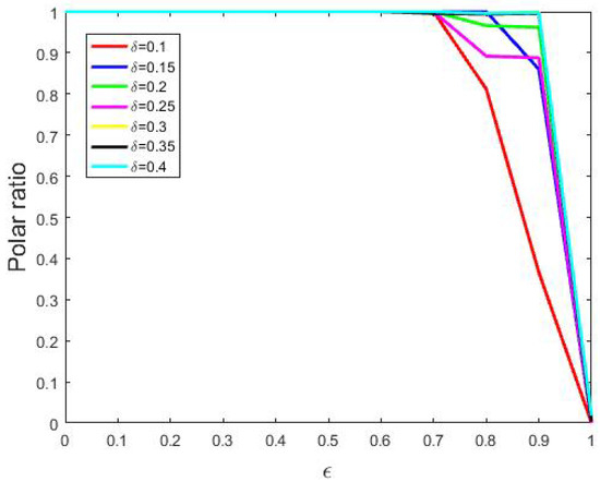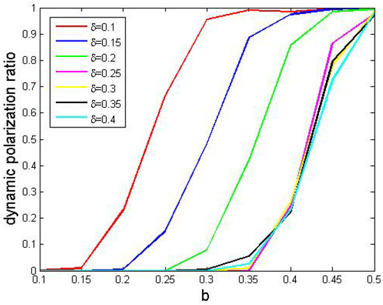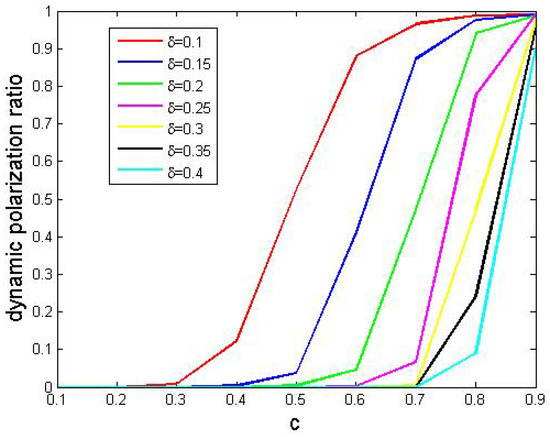Below, in each simulation, we set , and . Then, we considered all combinations of and and then tested their effects. We found that the results were similar to those presented in Figure 11; therefore, we also used Definition 8 to depict such phenomena. We ran simulations with all combinations of parameters, 500 times for each. Finally, we reported dynamic polarization ratios in Figure 13, in which each curve corresponded to a value.