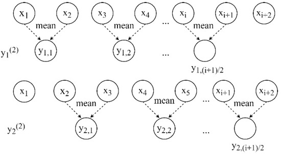 where is the probability of the dispersion pattern corresponding to the k-th coarse-grained sequence at scale . The RCMFDE multiscale coarse-grained process is shown in Figure 1, where is set to 2.