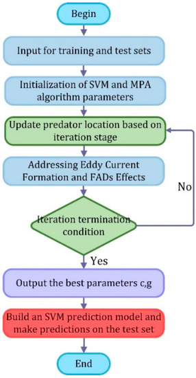 In view of the advantages of marine predator optimization algorithm, which is applied to the optimization process of SVM, and the flow chart of marine predator optimization support vector machine is shown in Figure 2. The specific steps are described as follows: