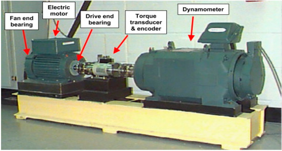 In order to get closer to the slight stage of rolling bearing fault, the bearing data of Case Western Reserve University in the United States were used to verify the effectiveness and accuracy of the diagnosis method proposed in this paper. Figure 3 shows the rolling bearing experimental platform of Case Western Reserve University. In order to enhance the persuasiveness, for the selection of vibration signal, the influence of bearing fault type and fault degree were fully considered in the experiment. The sampling frequency of the data selected in the experiment was fs = 12,000 Hz, the bearing test speed was 1797 r/min, and the motor load (horsepower) was 0. These data are vibration data collected by the accelerometer. The accelerometer was placed on the drive end, fan end and base of the motor housing; therefore three different types of data were generated. The acceleration data of the driving end was selected for the experiment.