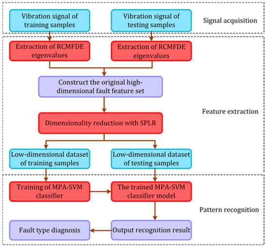 The experimental data specifically include vibration signals under four different working conditions (normal state, inner ring fault, outer ring fault, and rolling element fault). Table 2 details the label information of the experimental data. Among them, each group of fault data has 120,000 sampling points. Each sample takes 2000 sampling points, and each group of fault data has 60 samples. There are 10 groups of fault data with a total of 600 samples. A total of 1~60 are normal data; 61~120, 121~180, and 181~240 are inner ring fault data; 241~300, 301~360, and 361~420 are outer ring fault data; 421~480, 481~540, and 541~600 are the rolling element fault data. In this paper, a fault diagnosis method for RCMFDE-SPLR entropy characteristic optimization and MPA–SVM classifier is established. The process is shown in Figure 4. Specific steps are as follows: