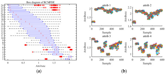 RCMFDE analysis results of different working conditions of rolling bearings. (a) Box diagram of RCMFDE; (b) Multidimensional visualization of RCMFDE.