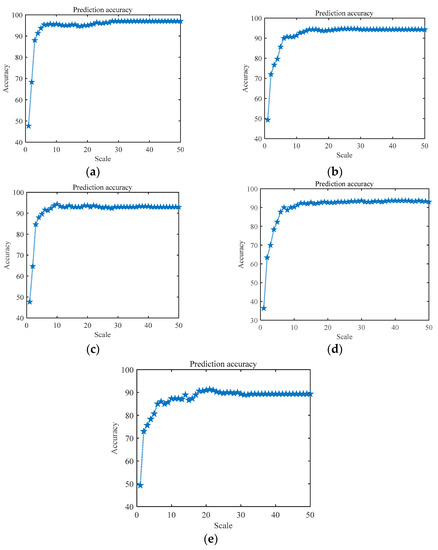 Recognition accuracy of multiple entropy values with different scale factors. (a) RCMFDE, (b) RCMDE, (c) MFDE, (d) MFE, (e) MDE.