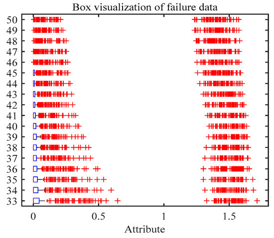 The scale factor is set to 50 above. Therefore, a 50-dimensional entropy value characteristic is extracted. Although the RCMFDE entropy characteristic has achieved good results, the characteristic set still has redundant information and reduces the recognition accuracy. Therefore, this paper reduces the dimensionality of the RCMFDE fault characteristic set through self-rhythm learning and low-redundant regularization (SPLR). In other words, we select the optimal subset from the original characteristic space. SPLR is a dimensionality reduction method that considers the training order of samples. At the same time, SPLR eliminates the noise and redundancy characteristics that may suppress the performance in the training process. Specifically, combining self-paced learning and subspace learning frameworks not only reduces the effect of noise, but also makes the reconstructed information more accurate. The basic idea of SPLR is to rank entropy characteristics according to their importance. It can be seen from Figure 11 that the 33–50-dimensional characteristics are mostly outliers. This results in SPLR not being able to obtain a unique sequence of important characteristics. Therefore, the RCMFDE entropy value characteristics of from 1 to 32 dimensions are selected in the experiment. In the experiment, the algorithm runs for 1.873 s, which verifies the efficiency of this method. In the experiment, 30 sets of data under different working conditions are selected as the training set, and the other 30 sets of data are used as the test set. In order to evaluate the influence of SPLR on the fault recognition rate, we input the selected fault characteristics into MPA–SVM for fault diagnosis.