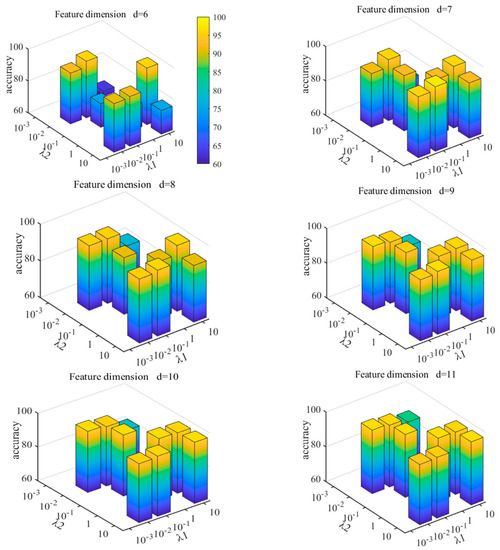 In this experiment, the SPLR parameters are fixed as , , the interval control parameter is , the update parameter of is , the maximum number of iterations is maxIter=50, the subspace dimension is K=600, and K is consistent with the number of samples. Considering that over-fitting will occur when and take {, }, this paper selects parameters from {, , , 1, } and conducts experimental analysis. If the resulting dimensionality reduction sequence is not unique in the experiment, the accuracy is set to a null value. The results are shown in Figure 12, where represents the characteristic dimension after dimensionality reduction.