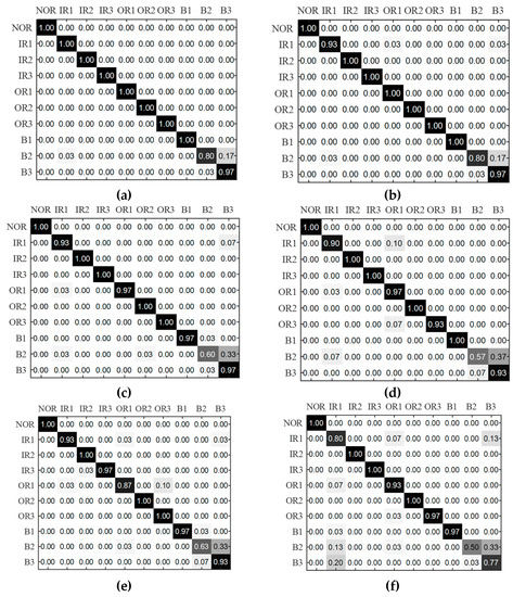 Recognition rate confusion matrix under MPA–SVM for each entropy value feature. (a) RCMFDE-SPLR, (b) RCMFDE, (c) RCMDE, (d) MFDE, (e) MFE (f) MDE.
