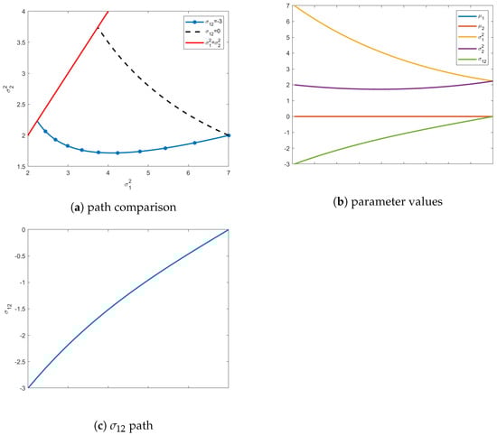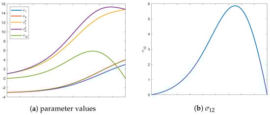 To reiterate this insightful behavior of information flow, a second example was conducted with a mean vector that starts in Quadrant III, , and seeks out a final mean vector in Quadrant I, , as shown in Figure 5. The initial distribution is still isotropic and the requirement to end isotropic remains. However, as seen in Figure 6, the values of acquire positive values along the geodesic. The path of the main diagonal variances remains unchanged.