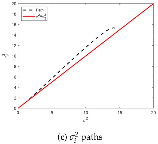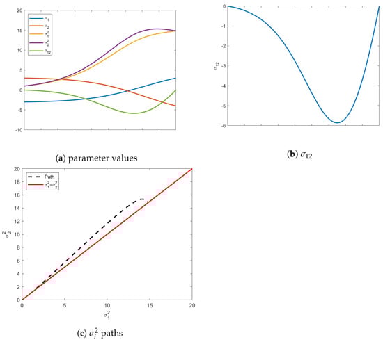 Illustration of geodesic paths from an initial isotropic distribution with a mean vector in Quadrant III and a final isotropic distribution with a mean vector Quadrant I. In (a), the evolutions of all five parameters are shown. Figure (b) highlights the values of showing that it leaves the constraint surface and acquires positive values in contrast to the previous example. The individual variances of the variables also temporarily abandon their required isotropicity as seen in Figure 3c. In (c), the dotted line shows the path of the and , with the solid red line representing the isotropic constraint surface.