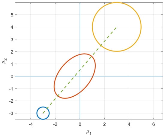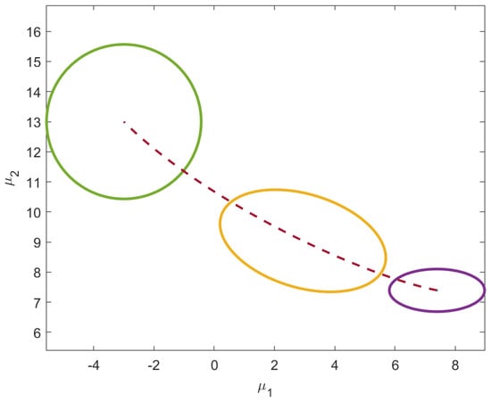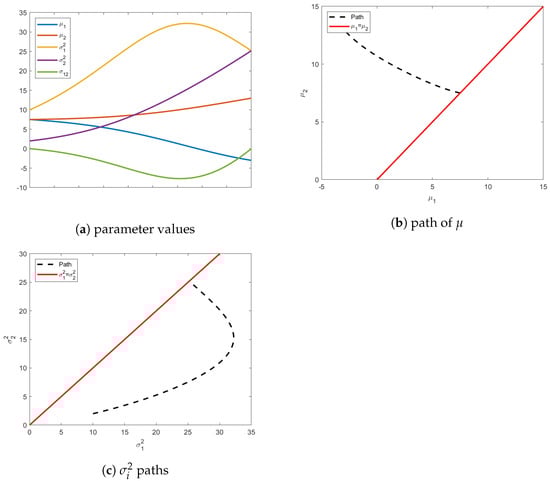 As shown in Figure 7, the unknown initial mean vector satisfying the is and the final isotropic distribution has . The behavior of the geodesic under these variable-endpoint conditions is shown in Figure 8.
