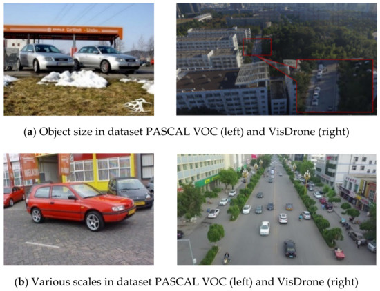 There exist some significant differences between nature images (e.g., PASCAL VOC [16]) and UAV images (e.g., VisDrone [17]), leading to two major challenges of object detection. The first challenge is that high-resolution UAV images tend to contain small objects (area < 322 pixels) and are generally sparsely distributed, as Figure 1a depicts. The features of small objects are difficult to describe because the small scale of the target is featured by fewer pixels, which is likely to cause information to gradually disperse or even vanish when they pass through a deep network. Sparse objects in images with a wide field of view are easier to be confused with complex backgrounds. Second, extreme object scale variation and special UAV perspectives can be present, as Figure 1b depicts. The UAV images of large-scale scenes are affected by the variety of altitudes and perspectives of UAVs. When UAVs shoot at lower altitudes, objects become more negligible. Objects become smaller when UAVs shoot at higher altitudes. Lengthening the perspectives also causes distant objects to become smaller. Even objects of the same class may differ several times in scale.