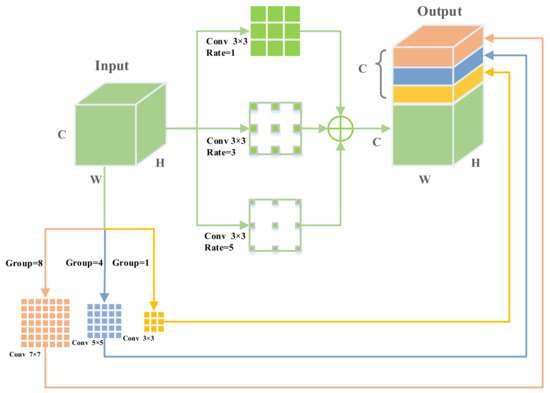 Considering that the atrous convolution loses detailed information, we add different groups of convolutions to supplement the different levels of detailed information. In addition, we also apply different sizes of convolution kernels to obtain different spatial resolutions, effectively alleviating object scale variation in UAV images. Grouped convolution is lightweight and efficient, adding a small amount of extra computation to improve performance. We use three levels of different kernel sizes: 3 × 3, 5 × 5, and 7 × 7, and the corresponding grouping depths are 1, 4, and 8, respectively. It can be formulated as follows: