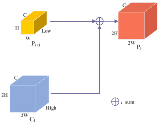 First, let us review the FPN structure, as shown in Figure 5. In FPN, high-level features use up-sampling operations and fuse with the feature maps at low-level features, enabling the low-level feature to obtain high-level semantic information. The resulting features are naturally endowed with different levels of contextual information. However, the significant problem is that merging adjacent layer features without special processing destroys feature consistency at scale and semantic levels. We introduce the FAM module to solve this problem. The structure of FAM is shown in Figure 6.