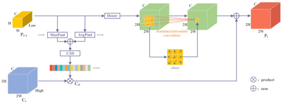 To further enhance the feature alignment ability, modulated deformable convolution [55] adds an adjustment mechanism based on deformable convolution, which can effectively adjust the offset of the perceptual input features. The modulated deformable convolution is defined in Equation (5):