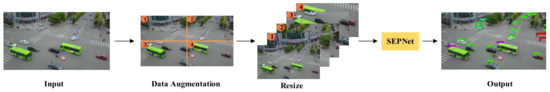 Data augmentation only processes the input image without changing the network structure or adding extra parameters. Therefore, it hardly adds extra computation and can be applied to various computer vision tasks. In SEPNet, we use a combination of geometric augmentations (such as horizontal flipping, random cropping of the images, resizing, etc.) and photometric augmentations (such as brightness adjustment, contrast adjustment, saturation adjustment, and adding noise to images) in data augmentation. In addition, we follow the training practices below: Most images are large in VisDrone, resulting in the disappearance of small target features after down-sampling by the deep network. Therefore, input images are uniformly divided into four patches without overlapping during training and inference. Each patch is fed into the network for further precise detection. Meanwhile, the original images are also forwarded to the network to detect large objects and prevent the clipped target from being undetectable. Finally, the detection results of each patch and the original image are combined to obtain the final result. The image is divided into a four patches strategy, as shown in Figure 7.