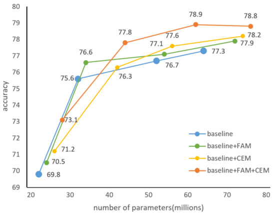 To verify the generalization ability of proposed method, two components were trained and tested on the PASCAL VOC dataset. We gradually added each component to the baseline model and analyzed the accuracy and number of parameter relationships using ResNet-19, ResNet-50, ResNet-101, and ResNet-152 as the backbone network, respectively. The experimental results are shown in Figure 8.
