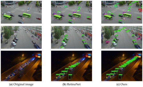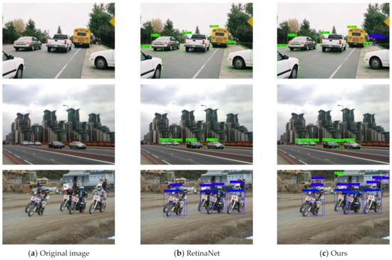 To further demonstrate the effectiveness of the proposed SEPNet more intuitively, we present some visualization results in Figure 9 and Figure 10. We compared our methods with RetinaNet. RetinaNet can only detect large objects close to the camera and misses small objects far away. Compared with RetinaNet, we proposed that SEPNet could detect not only large objects in the image but also small objects far from the camera. This indicates that our SEPNet can capture objects of different scales more accurately while paying more attention to the small object region rather than the surrounding background. It can be seen from the visualization results that SEPNet can solve the problem of missed detection of small objects well. It can also be seen that SEPNet can adapt well to object scale changes and improve detection accuracy.