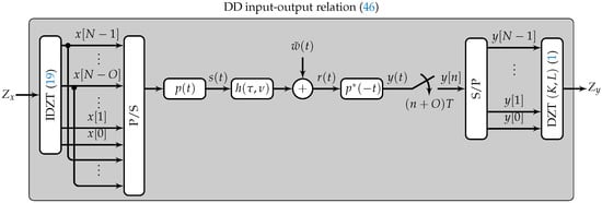 where , , and are the vectorized DTZs , , and , respectively. The vectors are all of length . The matrix describes the intersymbol interference in the DD domain. Because and have small support in the DD domain, the corresponding matrix is sparse. The matrix-vector formulation of the input–output relationship is the basis for many works on OTFS; for example, see [5,6].