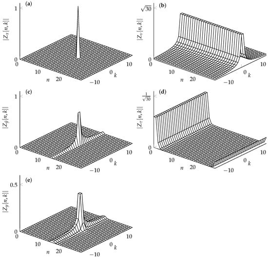It follows from (1) that the DZT for a given n is the unitary discrete Fourier transform (DFT) of a subsampled sequence . The variable n determines the starting phase of the downsampled sequence, whereas the variable k is the discrete frequency of its DFT. Thus, the variables n and k represent the time and frequency, respectively.