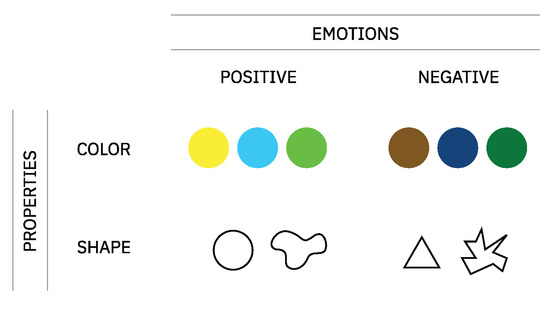 While we can find many experiments associating musical aspects to emotions, examples relating emotions to visual aspects are more limited to studying color (hue, brightness, and saturation) and shape. From the neuroscience point of view, it is known that the visual system is sensitive to a limited number of visual features. Contours (lines), shapes, colors, depth, texture, movement, and composition are the “building blocks of our perceptual experience” [5,25]. In general, brighter colors are most likely to be associated with positive emotions, whereas darker colors are linked to negative emotions [18,26]. Round shapes, for instance, have been primarily associated with positive emotions, such as calm and pleasure, whereas sharp shapes have been linked to negative emotions, such as fear and anger [25,27] (see Figure 3).