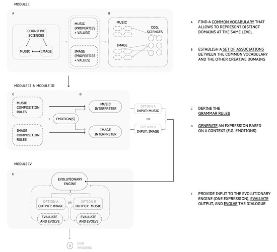 Moreover, the speed and modularity of current technology adds new forms of creation, together with an ability to interpret and evolve abstract concepts with certain degrees of autonomy [8,9,10,11]. In turn, this expressive capacity of computers opens doors to the development and exploration of creative languages, such as image and music. Driven by the computational potential of evolutionary processes, we propose a novel approach to the development of a creative tool capable of bridging the perceptual qualities of visual and auditory languages (see Figure 1). During the course of this work, on the one hand, we handle the challenge of an abstract representation and transposition of knowledge between multiple domains. On the other hand, we handle the computational expression, that is, the challenge of balancing freedom with rigid rules, a topic long discussed in the field of CC (computational creativity) [9].) and the evolution of these relationships.