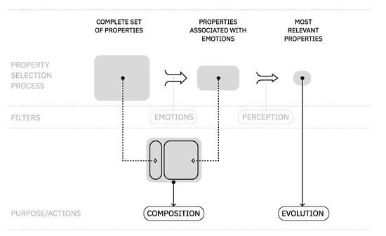 The results were similar when comparing the most relevant properties associated with the entire set of emotions with the most relevant ones associated only with the four selected emotions. That is because these four emotions have more associations with properties. Nevertheless, it is essential to highlight some differences: for example, regarding visual properties, “thickness” and “regularity” have higher relevance in the limited group of emotions; regarding musical properties, the differences are more expressive, with properties such as “tone attack” and “articulation variation” gaining more relevance, and “pitch level” losing relevance.