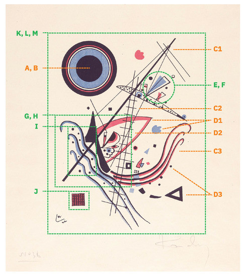 Visual analysis of Kandinsky painting, “Blue”, 1922. The orange lines concern “low-level” or “isolated” features and the green lines concern “high-level” or “composite” features. The letters in the image exemplify the following properties: (A, B) size and color; (C1, C2, C3) line thickness, regularity, and curve; (D1, D2, D3) shape contours, closure, and type; (E, F) elements overlap and geometric manipulations; (G, H) density and complexity of elements; (I) repetition of elements; (J) texture; (K, L, M) visual distribution, composition crowdedness, and variety of elements.