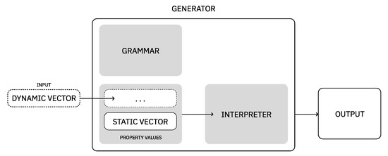 As for the process of generating music or images, they are composed of two main steps: definition of grammar rules and interpretation of the rules instantiated. In addition to this, we introduce two concepts: dynamic vectors and static vectors. A dynamic vector is a vector that will change or adapt to a certain context, that is, its values are not fixed (e.g., evolution purpose values). A static vector corresponds, for example, to a set of values that were pre-defined and do not change with different contexts, such as the values used for composition purposes only (see Figure 7). In the following modules, Module II and Module III, we detail the grammar rules defined for representing each domains’ expression and exemplify a possible interpretation of these rules.