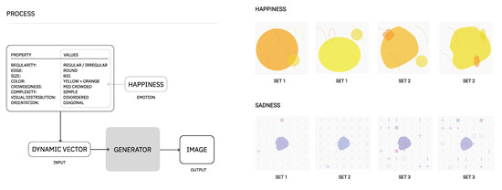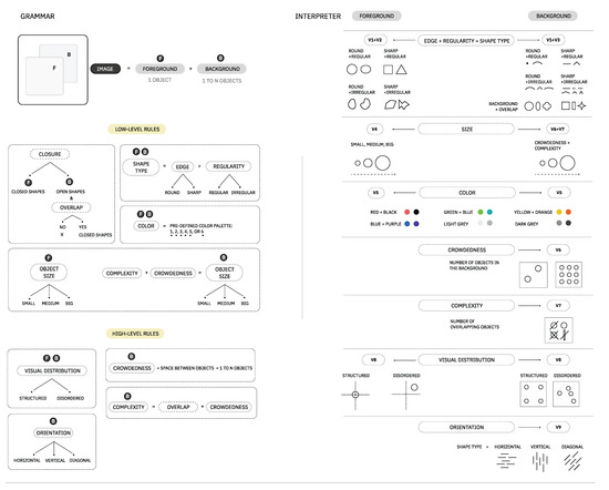As for the image vocabulary, it was chosen based on the visual element’s relevance to the creation of expressive visual communication and to the composition of an abstract image. We grouped visual features into four distinct sections: (1) high-level features, (2) low-level features, (3) object manipulations and (4) relationships among elements. Our choice for organizing visual attributes is justified by Christian Leborg’s proposed visual grammar [44]. Additionally, we completed the setlist of attributes with references from literature studies featuring abstract visual alphabets [14,31,45].