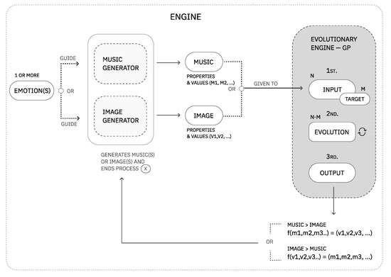 In this framework, the AV language is comprised of a vocabulary and a grammar. The vocabulary has three main alphabets: visual elements, music elements, and basic general emotions. The grammar is responsible for representing associations among elements of our vocabulary set. In this case, MG and IG act as interdependent co-creational processes.Given a pre-defined set of relationships between emotions and music/visual elements, we are able to generate music or image based on a specific context. The AV language can be explored and enhanced through an EE. The evolution of the elements’ combinations will depend on how the system is defined: automatic or interactive. While an automatic evolution is developed to have a system fully autonomous in its decision-making process [40], in future work, the introduction of user input will fall into an interactive evolutionary approach [11].