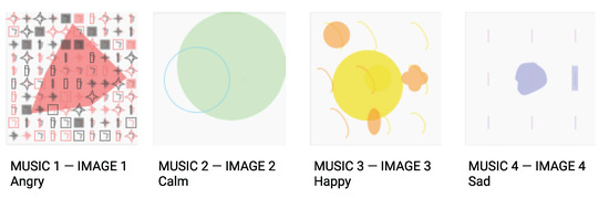 Crossing perceptual and emotional findings with auditory and visual characteristics may bring additional value to the expression of cross-modal associations of a creative nature. As such, we rely on music and image elements, emotions, and perception studies to draw a dataset of the most perceptually relevant properties for our study. Our choice of working with abstract images is grounded on a study by Melcher et al. [5], where they suggest that the perception of abstract artworks can be used efficiently in the representation of emotions. We note that we are working toward emotion perception (EP), which is not the same as emotion induction [6,7].