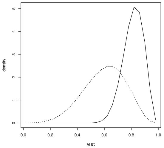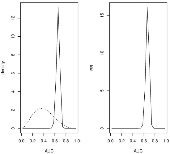 Although this specifies the same prior for the two populations, this is easily modified to use different priors and, in any case, the posteriors are different. Again it is necessary to check that the AUC  but also to check that  exists using the full posterior based on this prior and for this we have the hypothesis  given by Corollary 1. If evidence in favor of  is found, the prior is replaced by the conditional prior given this event for inference about  This can be implemented via importance sampling as was done in Example 3 and similarly for the posterior.