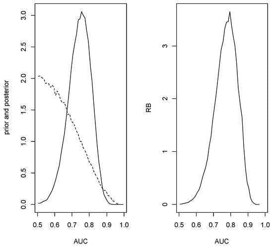In Example 2, plots of the prior (- - -), the posterior (—) and the RB ratio of the AUC.