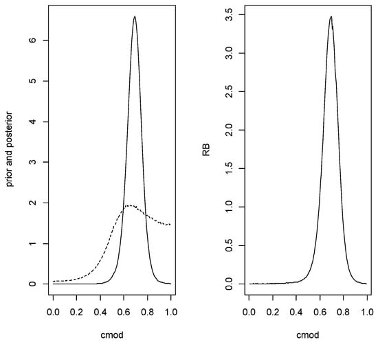 If the full data set is based on sampling scheme (ii), then  binomial A natural prior  to place on w is a beta distribution. The hyperparameters are chosen based on the elicitation algorithm discussed in [] where interval  is chosen such that it is believed that  with prior probability  Here  is chosen so that we are virtually certain that  and  then seems like a reasonable choice. Note that choosing  corresponds to w being known and so  in that case. Next pick a point  for the mode of the prior and a reasonable choice might be  Then putting  leads to the parameterization beta beta where  locates the mode and  controls the spread of the distribution about  Here  gives the uniform distribution and  gives the distribution degenerate at  With  specified,  is the smallest value of  such that the probability content of  is  and this is found iteratively. For example, if  and  so w is known reasonably well, then  and  so the prior is beta and the posterior is beta