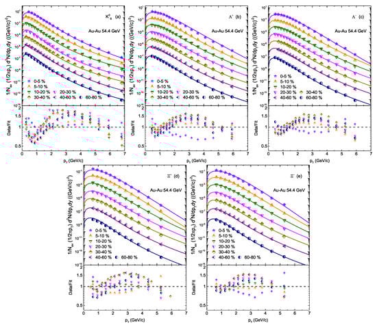 Transverse momentum spectra of , () and () in Au+Au collisions at = 54.4 GeV in different centrality bins from the STAR experiment [] fitted with Tsallis-like distribution. Data/fit ratio is also shown at the lower panel.