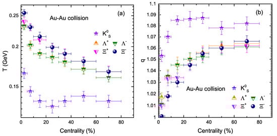 In order to check the trend of parameters in respect to centrality, we present Figure 2a, which shows the effective temperature as a function of different centrality classes, where a strong centrality dependence of effective temperature T is observed. This behavior shows that a large amount of energy is transmitted to the interacting system due to the barbaric reaction in central collisions systems, which decreases towards lower centrality classes. It can also be observed that T values are larger in the case of a heavier particle, i.e., T () > T () > T () for all centrality bins. However, in comparison to other strange particles, , as a lighter particle, shows non-monotonic centrality dependence and the value of T is smaller. In addition, T is seen to be higher with the increase in strangeness content, indicating that multi-strange particles freeze-out earlier. The degree of non-extensiveness of the system is reflected by the entropy index q, presented in Figure 1b. When , it means that the system is in equilibrium state, while a non-equilibrium state of the interacting system happens when . Figure 1b shows the centrality dependence of entropy index q for , () and () in Au+Au collisions at = 54.4 GeV. It can be seen that the q value increases from central to peripheral collisions for all strange particles. The q-value of () and () in central collisions is close to unity, which indicates a rapid approach of the system to equilibrium, while towards periphery, the system deviates far from a state of equilibrium. However, no strong centrality dependence is observed in case of q-value and it is almost independent of centrality. However, the q-value for is observed to be higher as compared to other particles under study, which indicates that hardly interacts with the created medium in the collision and shows a minimal tendency for equilibrium.
