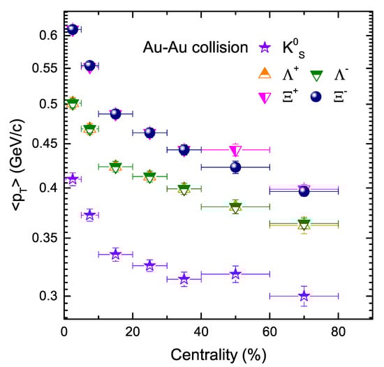 Comparison of transverse momentum () as a function of centrality of different strange hadrons.