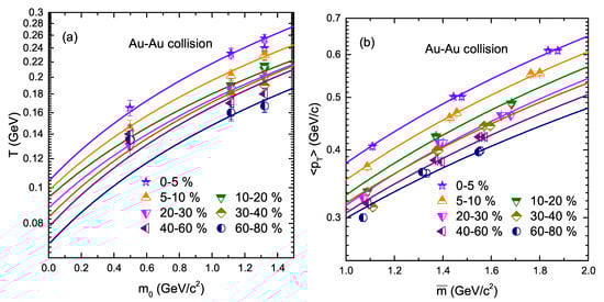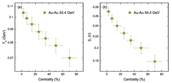 The study of the kinetic freeze-out stage is very complex, and important single, double, triple, and differential (multiple) freeze-out scenarios have been reported in different studies [,,,,,,]. Additionally, the freeze-out temperature is observed to show an increasing trend with colliding energy up to 10 GeV as well as centrality, which is also very complex [,,,]. The increasing trend of with collision energy becomes indefinitely saturated, which could be due to the flow effects. On the contrary, the contributions of flow effects and thermal motion are taken into account in the effective temperature T, which has definite trend and is different from . The dependence of kinetic freeze-out temperature on centrality is also very complex, and has shown different behavior in different literature, i.e., an increasing trend of kinetic freeze-out temperature from central to peripheral collisions [], a decreasing trend from central to peripheral collisions [,,,], and invariant from central to peripheral collision [].