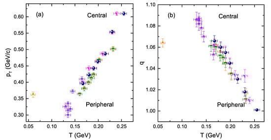 Figure 6 shows the correlations of the parameters with each other. In the left, Figure 6a shows the correlation of and T while Figure 6b shows the correlation of q and T. Each data point in panel (a) and (b) show the correlation of and T, and q and T in each centrality bin, respectively. The positive correlation among and T is reported, which evinces that the larger (energy) is transferred to the system due to the very intense collision. This corresponds to a higher degree of excitation and results in a larger . However, Figure 6b reported a negative correlation among q and T. Larger T for heavier particles and in central collisions refers to the quick approach of equilibrium of the system. On the other hand, smaller q refers to the state that is close to equilibrium. Hence, q is smaller for heavier particles and in central collisions system, and T is larger for heavier particles in central collisions.