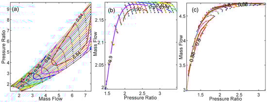 The published compressor map is utilized, and using the design pressure ration, mass flow rate, and isentropic efficiency, the approximate compressor characteristics are determined as follows