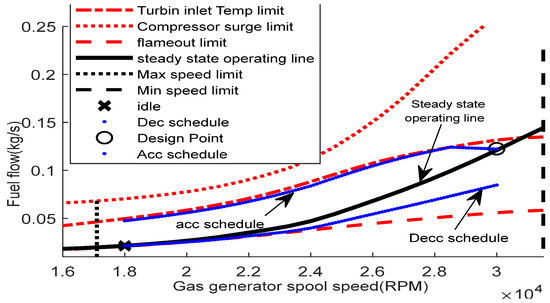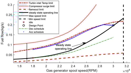 The GT engine has an operational range because of the performance limiters that construct the fuel boundaries. These limiters include the surge, turbine inlet temperature (TIT), minimum spool speed, maximum spool speed, and flameout limits. Figure 1 illustrates the typical GT fuel boundary [10]. The control system of the GT engine should facilitate the engine operation within this fuel boundary to ensure engine safety.