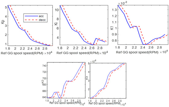 Huang et al. [19] proposed the gain scheduling for explicit model predictive control for a diesel engine air path. The optimizations of a quadratic programming problem were solved using Newton’s method and a nonlinear optimizer in MATLAB’s fmincon. Liu et al. [20] presented an improved version of the gain scheduling technique which can achieve the expected performance and stability for an aero-engine. The proposed method involved the scheduling parameters variation. Gou et al. [21] proposed a robust gain-scheduling using the estimation of the engine performance degradation. Robust controllers considering the normal engine operation and performance degradation were constructed at the operating conditions set. The controllers’ schedules were designed based on the appropriate scheduling and health of the parameters.