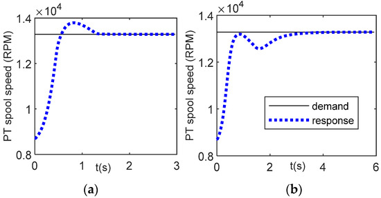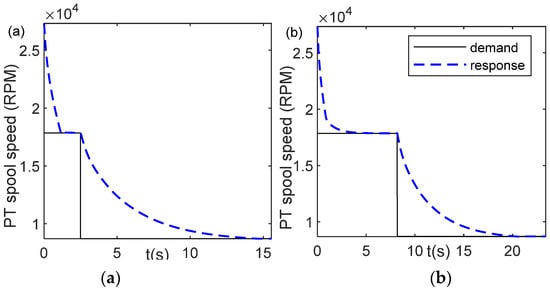 Controller response for Case 2, deceleration from maximum speed to idle speed, PLA = [0.5 0]; (a) optimal parameter a = 27.2848; (b) unoptimized parameter, a = 1.