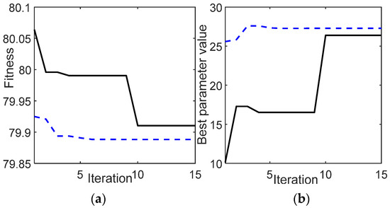 Case 2, deceleration from maximum speed to idle speed, PLA = [0.5 0]; (a) fitness value; (b) best parameter value evolution.