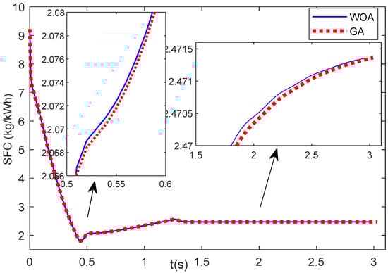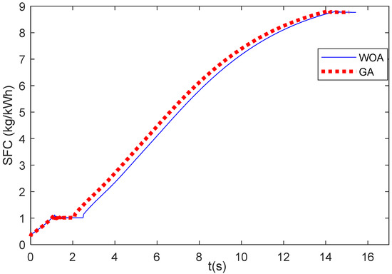 This section observes the specific fuel consumption (SFC) during the engine acceleration and deceleration phases. Figure 15 shows the SFC during the engine acceleration of Case 1. It shows that the SFC obtained from the results of GA and WOA does not show much difference. The SFC values of the WOA are a little above the SFC values of the GA. Figure 16 illustrates the SFC values during the engine deceleration of Case 2. It shows that the SFC value of the GA results is higher than that of the WOA results.